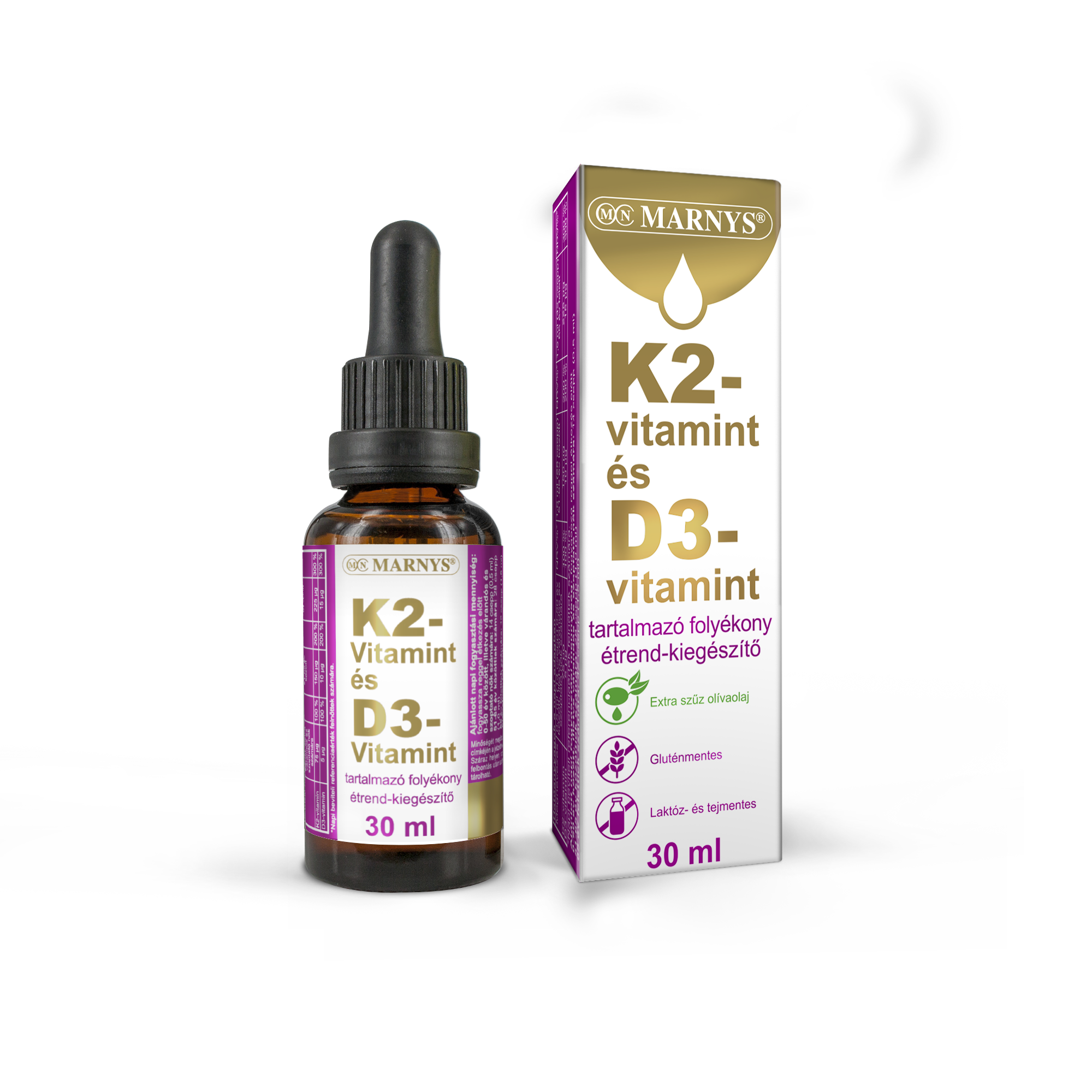 MARNYS K2- és D3-VITAMIN tartalmú folyékony étrend-kiegészítő a megfelelő felszívódás és stabilitás biztosítása érdekében olívaolajban oldva tartalmazza folyékony hatóanyagait, így a D3-vitamint (kolekalciferol) és K2-vitamint (menakinon-7). A K2- és a D3-vitamin szinergiája szerepet játszik a megfelelő kalcium-anyagcserében, ezzel elősegítve a csonttömeg fenntartását, valamint a szív- és érrendszer védelmét.